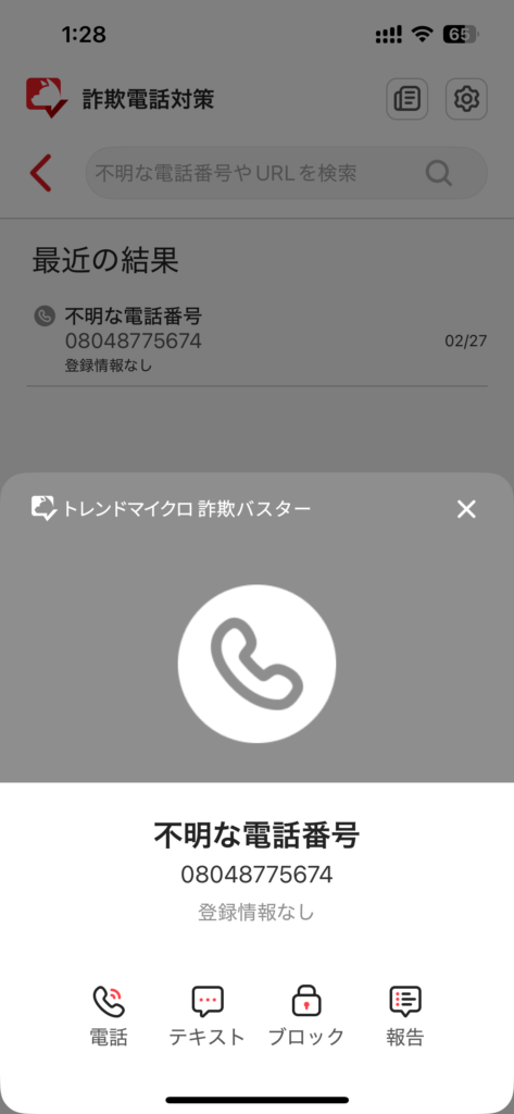 上記は080の電話番号は日々増えているのでデータベースへの登録が間に合わいないと思います。詐欺バスターを利用の皆さんからの報告でデータベースがアップデートできるのであれば、詐欺バスターは AIのように日々成長するアプリでしようか。